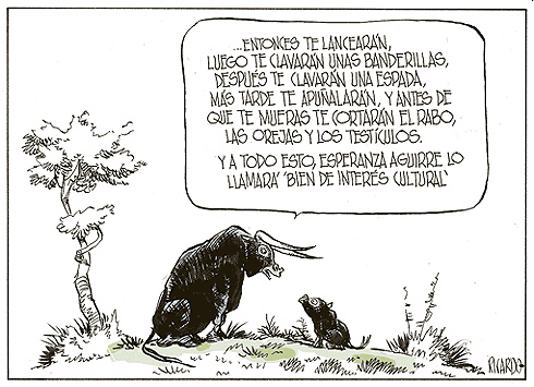 Y todo por primar la tradición que ellos prefieren. En esa su trayectoria, no me extraña que librerías, cines y teatros vayan echando el cierre mientras la derecha que nos gobierna se plantee en un futuro resucitar la Inquisición o las ejecuciones en la plaza pública, en línea con las tradiciones de violencia de las que se sienten depositarios. Pero nada de resignación, ¿eh? En cuanto podamos, ¡se acabó la Fiesta! Ya dura demasiado y es cuestión de ponerse a trabajar. Siquiera para quitarnos de encima esta histórica vergüenza.