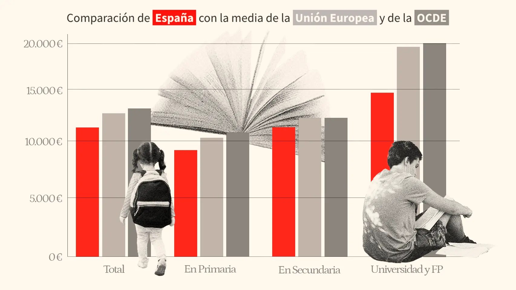 En cuanto al presupuesto para educación primaria y secundaria, la inversión dedicada a la misma nos sitúa a la cola de Europa aunque se haya duplicado en los últimos años hasta alrededor de los setenta mil millones.